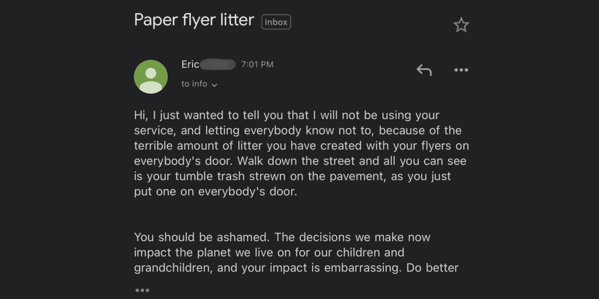 Thank you for taking the time to share your concerns about the environmental impact of our flier distribution. The door hangers we distributed are made from recycled materials and are biodegradable, a decision we made foreseeing the possibility that some hangers may not be disposed of correctly.